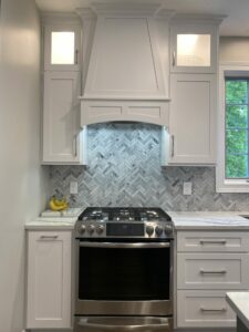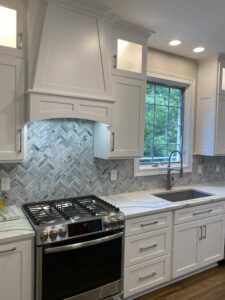 White Cabinets with White Countertops, Gray Island with White Countertop, Custom White Range Hood, Gray Herringbone Tile, Gray Chandelier